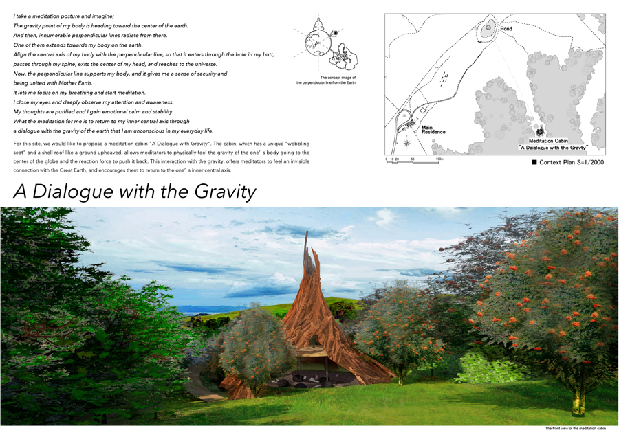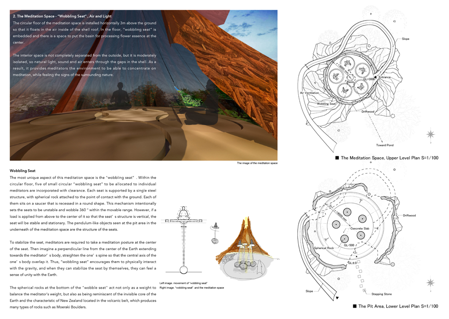 ニュージーランドに瞑想キャビンを作る計画。森の中を抜けると、まるで地面が隆起し、地球内部のエネルギーが空に向かって登っていく様を表したようなキャビンが見えてくる。キャビンの周囲を巡る緩やかなスロープを登り、瞑想キャビンの内部へと入る。キャビンの床には、5つの円形状に切り抜かれた「揺れる座面」が組み込まれている。座面は地面へと伸びる1本のスチールによって支えられ、地面との接点には球体の岩が取り付けられており、あえて不安定に揺れる構造になっている。瞑想者は座面中央で座禅を組み、地球の中心へとまっすぐに向かう重力の垂線をイメージし、自らの 重心軸をそこに沿わせるように意識しながら背筋を伸ばして座ることにより、座面を安定させることができる。まさに地球との一体感を感じながら、瞑想を始めることができる。 This is an architectural plan to build a meditation cabin in New Zealand. When you pass through the forest, you will see the meditation cabin as if the ground is uplifted and the energy inside the earth is uplifing to the sky.If you go on the gentle slope around the cabin, you can enter the meditation cabin. On the floor, the five circular seats called "wobbling seats" is incorporated.The seat is supported by a single piece of steel that extends to the ground, and a spherical rock is attached to the point of contact with the ground that aim to shake unstably. The meditator need to form zazen in the center of the wobbling seat and imagin a vertical line of gravity that goes straight to the center of the earth and consciously make straight their back to along the line to make the seat stable. Feeling a sense of oneness with the earth, they can start their meditation.