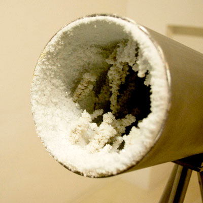 Solo exhibition ‘The Pulsating Earth’ (Palma de Mallorca, Spain) In Buddhism, cave is often compared to womb of Buddha, and there is a legend of that if a person engage in deep introspection while he is walking through a cave, the man will feel as if he had reborn. From this legend, cave has been sanctified as a place to look at the origin of the person. So, what is the origin for all living creatures on the earth? That is the sea. I obtained salt from seawater and created a salt crystal cave inside of the telescope ‘to look into’. I think that the growth process of crystal is similar to our life or history, and wish viewer look back on their roots and man’s relationship with natural environment.