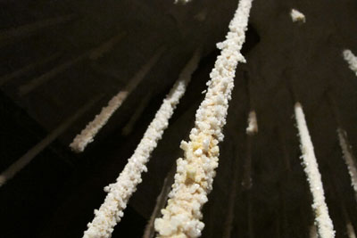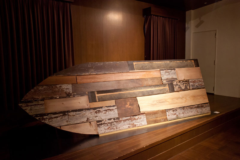 This gallery building used to be the Kano Bank that is the antecedent of current Hokkoku Bank. The founder of this bank is Kometani whose family had run Kitamaebune (the merchant ships)business in Edo period, 1600-1868. Thus I wanted to create artwork from the research of Kitamaebune. Unasaka is the word of myth, which means the border between human world and sea goddess. The sailing technique in Edo period was under development caused drift accidents. The written reports describe the ferocity of the sea and frights of sailors. ‘The sea waves are high like mountains…wished to boat goddess, but storm doesn’ t stop. Through away loadings and cut off the mast to forbid capsizing. …after the storm gone, I can see only the sea and have no idea where I am. Everyone on the boat cut their hair and asks the sea goddess the direction we should go. Shared the rest of food, but it doesn’ t help to stop dyeing members’(Kano drifting report). I think it was the sailing on the border of life and death that might be Unasaka. I created the imaginary bottom plate of the boat inspired by the Japanese sailor’ s word “the separation between here and hell is just a bottom plate of the boat” that is the wisdom to teach the interaction with nature always follows dangers. And then I put salt crystalized pillars from the behind of it. The pillar is the symbol of memory, which I have been using recent years in my work, and in this time, each pillar indicates sailor’ s memory and those are preserved by salt.
